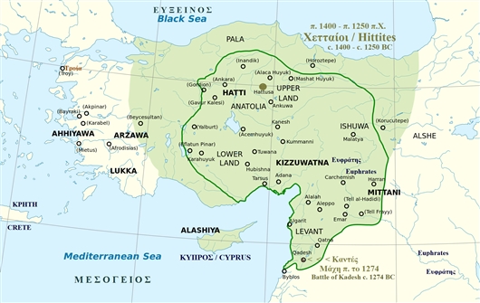 The Hittite Empire, approximate extent of the maximum area of the Hittite rule (light green) and the Hittite rule ca. 1350-1300 BC (green line) during the reign of Ṡuppiluliuma I.