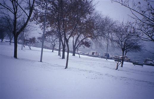Παλαιά Πόλη, Κεράτιος κόλπος [Άγιος Νικόλαος Τζιμπαλί (εκκλ. συγκρότημα, ναός Αγίου Νικολάου και Αγίασμα Αγίου Χαραλάμπους) φωτ 05]. Χιονισμένη η προκυμαία μπροστά στον Άγ. Νικόλαο Τζιμπαλί, το χιόνι καλύπτει και τις βάρκες.