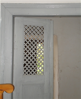 Άγ. Αθανάσιος στον Άγιο Γεώργιο Νηλείας (Ν. Πήλιο), ναός, φωτ 14α. Από τον νάρθηκα προς το προστώο: ξύλινη θύρα με καφασωτό παραθύρι, απ’ όπου φαίνεται και το δυτικό παραπόρτι του ναού –το οποίο είναι ανοικτό κι έτσι διακρίνονται στο βάθος τα δέντρα.