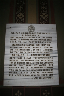 Το κείμενο αναφέρεται στην ανακαίνιση του εκκλ. συγκροτήματος, που έγινε στη μνήμη του Νικόλαου Βαρδινογιάννη, με δωρεά της συζύγου του Μανουέλας Βαρδινογιάννη και των παιδιών του Ιωάννας και Πύρρου, με την προτροπή και τις ευλογίες του Οικουμενικού Πατριάρχη Βαρθολομαίου. Τα θυρανοίξια του Αγίου Νικολάου έγιναν στις 6 Δεκεμβρίου του 1998.