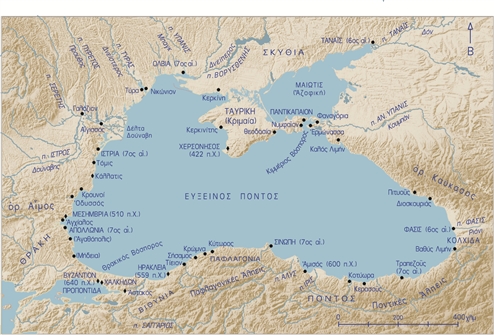 Εμπορεία – λιμανόσκαλες – ποταμόσκαλες – πόλεις και μητροπολιτικά ευξεινοποντιακά κέντρα στην Αρχαϊκή και την Κλασική εποχή: 7ος - 4ος π.Χ. αιώνας. Σε παρένθεση οι χρονολογίες ίδρυσης των κυριοτέρων από αυτές. Με βούλα σημειώνονται οι ιωνικές και οι λιγοστές αιολικές πόλεις, με ρόμβο οι δωρικές (μεγαρικές).