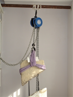 Νέα Αρχαιολογική Συλλογή, Χερσόνησος (Σεβαστούπολη, Κριμαία) φωτ 09. Το έργο της μεταφοράς και τοποθέτησης των εκθεμάτων στο υπό διαμόρφωση νέο Μουσείο, που θα είναι το δεύτερο Μουσείο της Χερσονήσου-Χερσώνος, συνεχίζεται: η αρχαία ελληνική στήλη, που κρέμεται από το βίντσι για να τοποθετηθεί στην θέση της, έχει προστατευτεί με ένα κομμάτι πανί (ένα μαντήλι;) μωβ χρώματος. Σκηνή άκρως συγκινητική, γιατί είναι φανερή η τρυφερότητα με την οποία φροντίζουν οι αρχαιολόγοι τα σπουδαία ευρήματα τους κάτω από πολύ δύσκολες συνθήκες.
