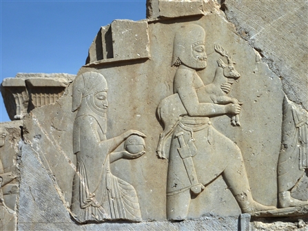 Περσέπολη, Ταχάρα φωτ 206. Κλιμακοστάσιο της νότιας στοάς του ανακτόρου. Υπηρέτης και ιερέας (;) μεταφέρουν σκεύος (;) και ένα ελαφάκι για θυσία.