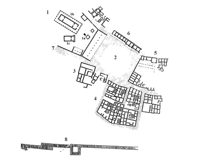 5 = Γυμνάσιο ή Θέρμες (λουτρά), 6 = Στοά με καταστήματα